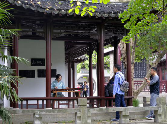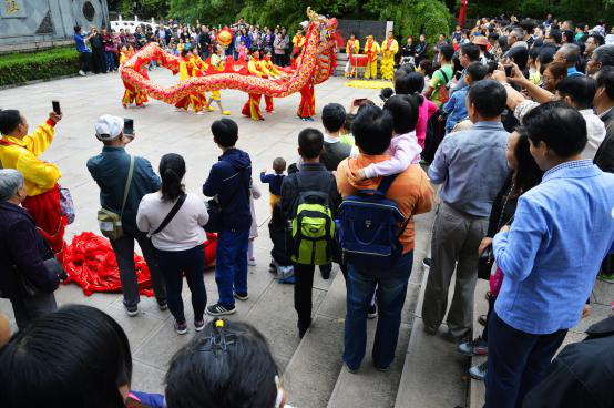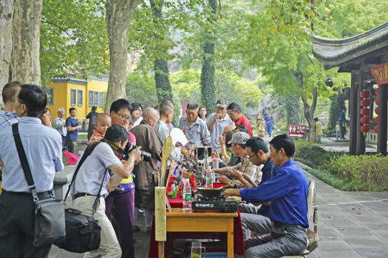 活动现场,焦山门牌坊广场上的“二龙戏珠”表演可谓精彩纷呈。锣鼓喧天,管乐齐鸣,热闹的奏乐吸引了大量刚下船的游客。只见两条金黄色和宝蓝色的龙缠绕在一起,摆出各种造型,引得游客们拍手叫好。在枫杨广场和青螺居广场上演的“春城马灯”和“宝堰双推车”民俗表演也是可圈可点、引人入胜。民俗表演艺术家们或是跟随音乐不断变化阵型,或是边唱边舞,围观的游客们纷纷拍照留念。焦山碑林景区内还有古琴演奏,高山流水,琴韵悠长。除此之外,还有深受大众喜爱的民间艺术家展示“太平泥叫叫”、“面塑”、“糖画”、“烙铁画”和“中国结编织”等传统技艺。有些感兴趣的游客向民间艺术家学习编织中国结,他们表示,这次游览的经历不虚此行。